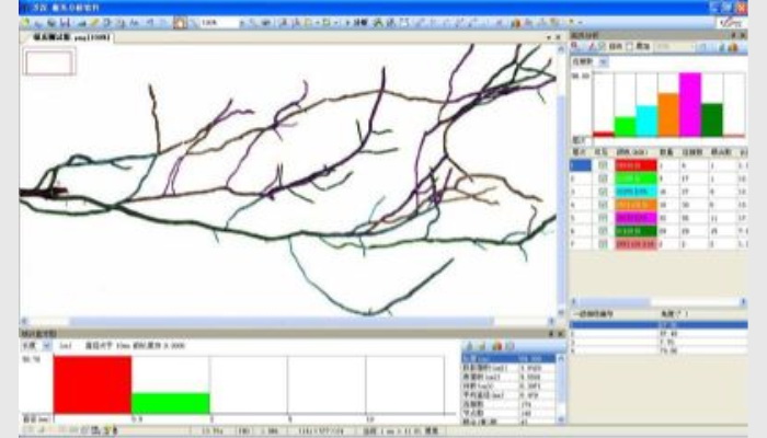 (3)能進行根系的拓撲分析,自動確定根的連接數(shù)、關(guān)系角等,還能單獨地自動分析主根或任意一支側(cè)根的長度和分叉數(shù)等,可單獨顯示標記根系的任意直徑段相應(yīng)各參數(shù)(分檔數(shù)、檔直徑范圍任意可改,可不等間距地自定義),并能進行根的分叉裁剪、合并、連接等修正,修正操作能回退,以快速獲得100%正確的結(jié)果。