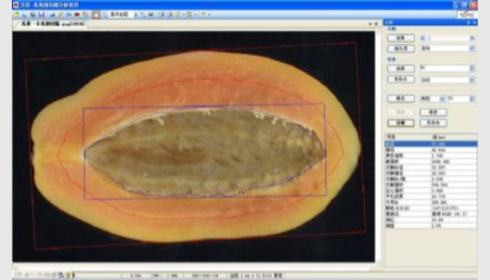 (2)可測哈密瓜等甜瓜的:縱徑、橫徑、果形指數(shù)、截面積、肉厚、外周長、瓤色分檔分析、種腔(縱徑、橫徑、面積)。