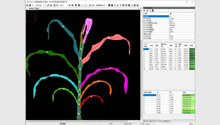 (4)玉米株形分析:葉片數(shù),葉片長、寬,葉片彎曲度,葉片投影面積,莖稈分節(jié)數(shù),分節(jié)長、粗,葉片顏色等,并可編輯。