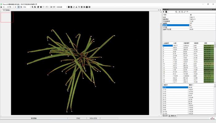 (5)其它:不同生長時期自動批量化處理分析,多植株網格分析,直線、角度等幾何測量,各測量結果可編輯修正。